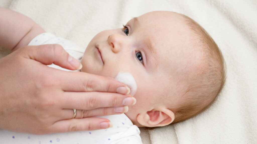 Có rất nhiều loại kem dưỡng da, kem dưỡng da hoặc sữa tắm. Tuy nhiên, bạn nên lưu ý chọn những sản phẩm uy tín, có thành phần an toàn và ít hoặc không chứa mùi hương tổng hợp. Việc sử dụng các sản phẩm chăm sóc có mùi thơm thường không được khuyến khích cho trẻ nhỏ vì chúng dễ bị dị ứng. Thời điểm tốt nhất để sử dụng các sản phẩm chăm sóc da cho bé là sau mỗi lần tắm. Đảm bảo bạn dưỡng ẩm da cho trẻ sau mỗi lần tắm và đặc biệt nếu trẻ nhận thấy các dấu hiệu khô da.