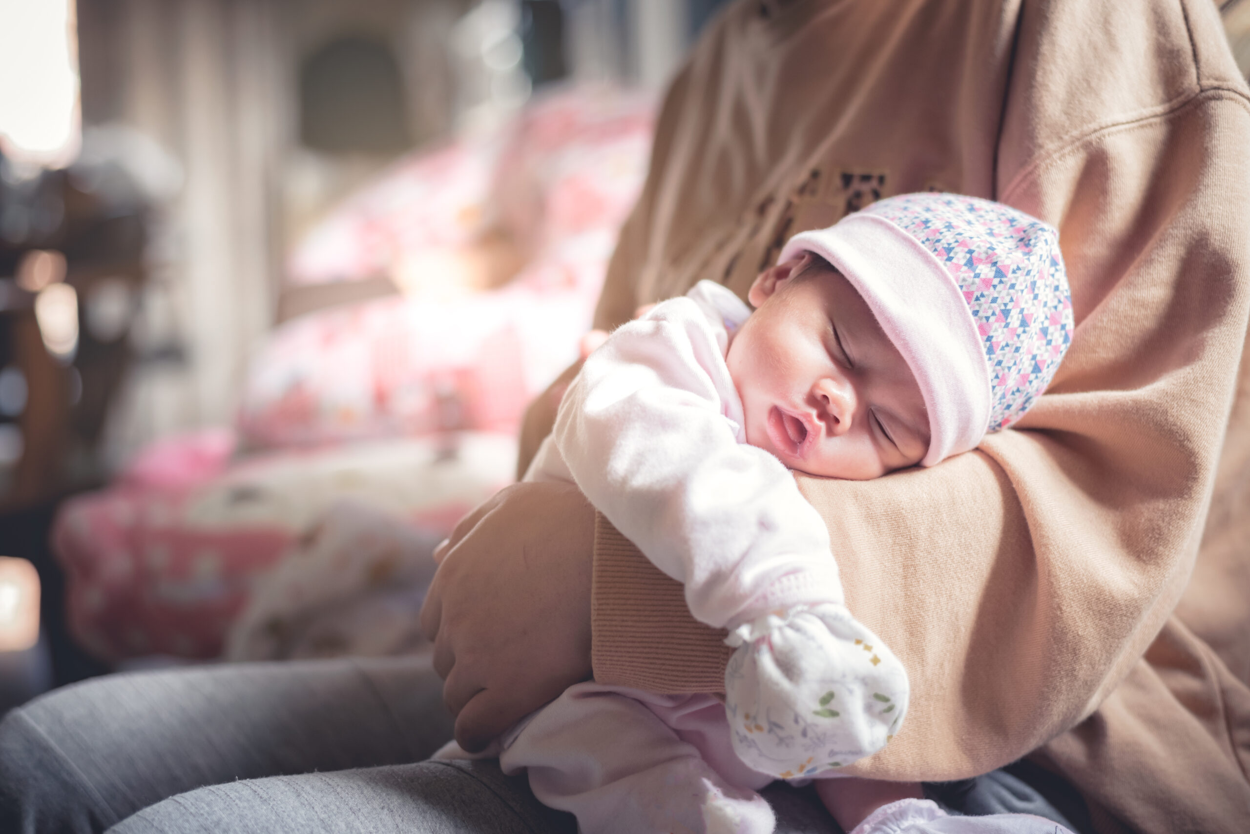 cute baby sleep on hand’s mom