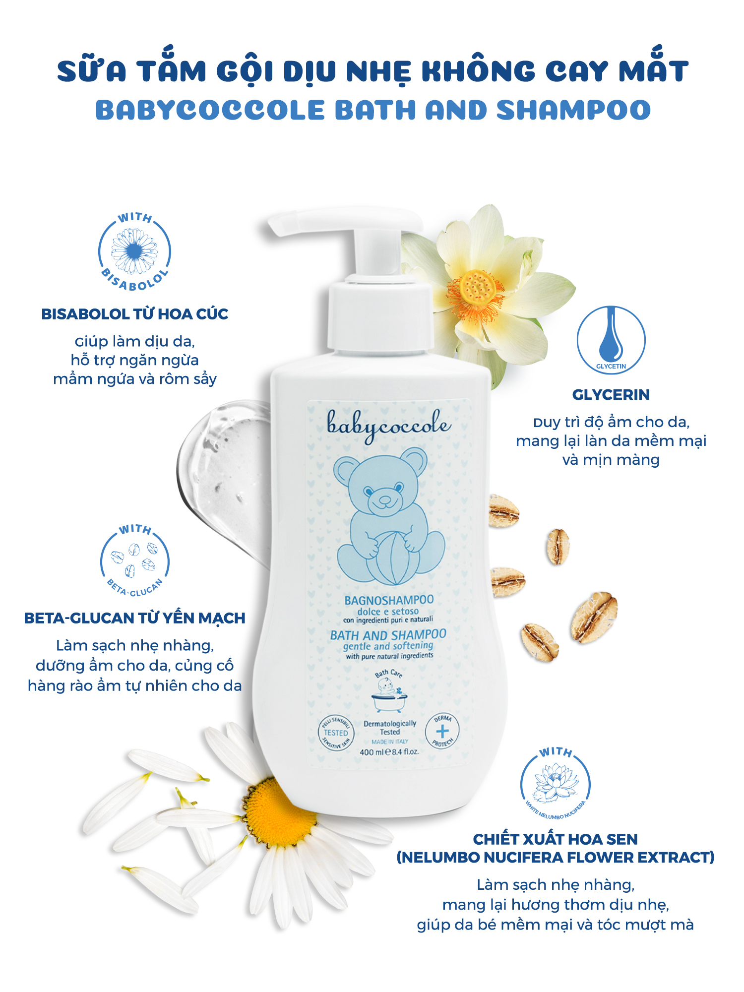 – Chiết xuất yến mạch, hoa cúc và hoa sen giúp làm sạch và dưỡng ẩm da bé